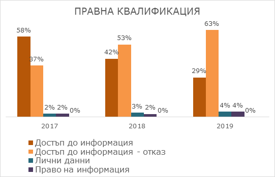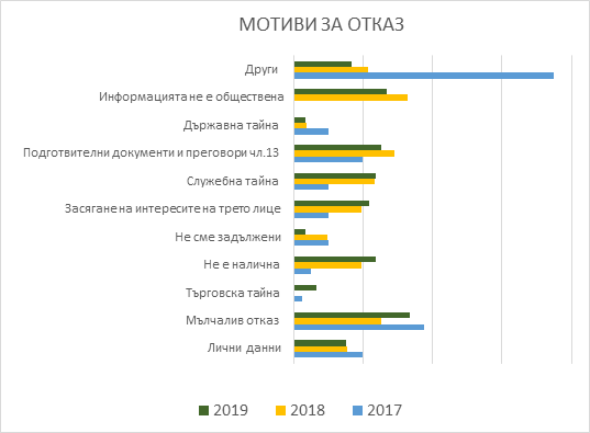 През 2019 г. преобладават мълчаливите откази – 20%, които са се увеличили в сравнение с 2018 г., когато са 13%. На второ място са отказите, в които се твърди, че исканата информация не е обществена - 16%, или, че не се предоставя по ЗДОИ – 6%. На трето място са отказите, в които основанията са, че исканата информация представлява подготвителни документи без самостоятелно значение или преговори по даден въпрос (чл.13 ал.2 от ЗДОИ) – 14%.