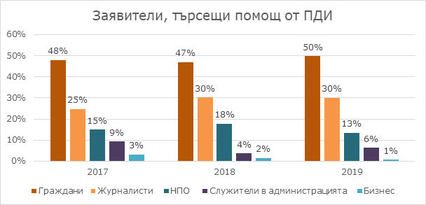 Най-често към ПДИ за правна помощ се обръщат граждани, журналисти и неправителствени организации. И през 2019 г. най-много консултации са предоставени на граждани - 78 случая. От неправителствени организации са постъпили 21, а в 47 случая са ни потърсили журналисти от централни и местни медии и координатори на ПДИ. В 10 случая екипът ни е бил потърсен за консултация от служители в администрацията, а в един – от представители на бизнеса и др.