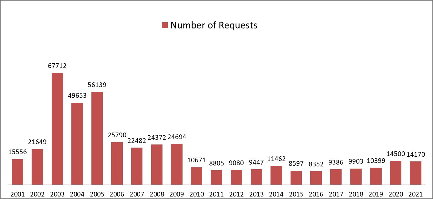 The chart below shows the discrepancy between the reported number of requests, the issued decisions, and the requests left without consideration till 2009.