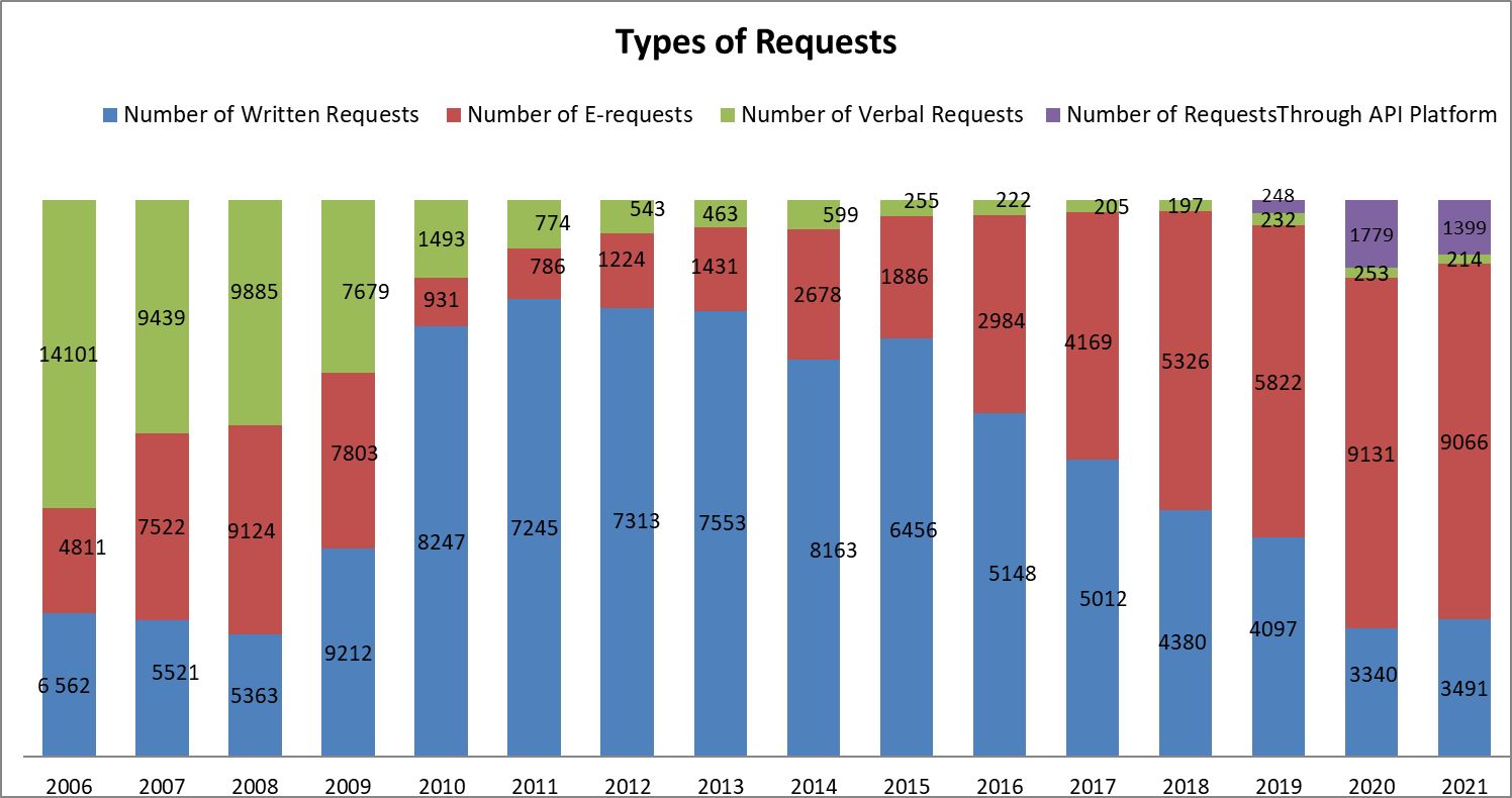 The total number of requests received by the institutions has been decreasing. The tendency finds its explanation in the proactive publication on the websites of the obliged bodies of specific categories of information, which should have been requested during the first years of the APIA implementation. On the other hand, the decrease in the number of the written requests and the e-requests that have been equaled to them is not so high.