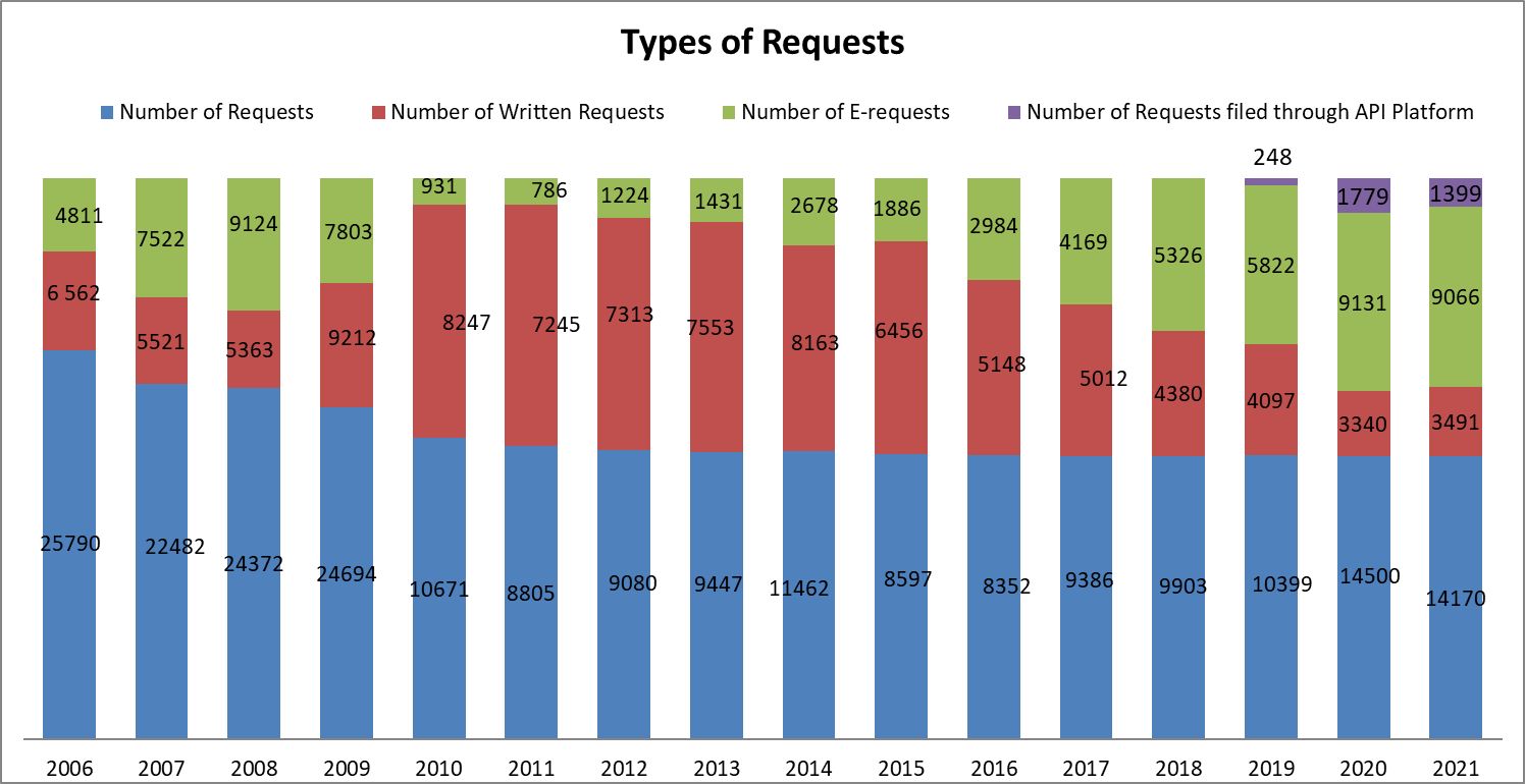 Administrative decisions on access to information requests are by rule issued only on written requests, the electronic requests being equaled to written. In 2021, 1399 e-requests were filed through the Platform of Access to Public Information maintained by Council of Ministers: https://pitay.government.bg/PDoiExt/