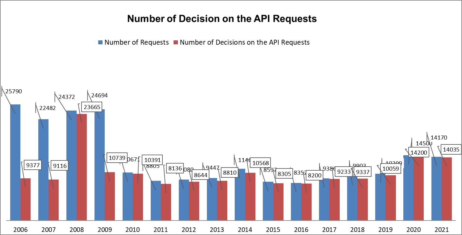 The reports on the number of requests and the administrative decisions issued on them show the development of APIA implementation during the years. The chart below shows the big difference between the reported requests and the decisions issued on them till 2010. Only since 2010, the number of requests and the number of administrative decisions on them start to get closer.