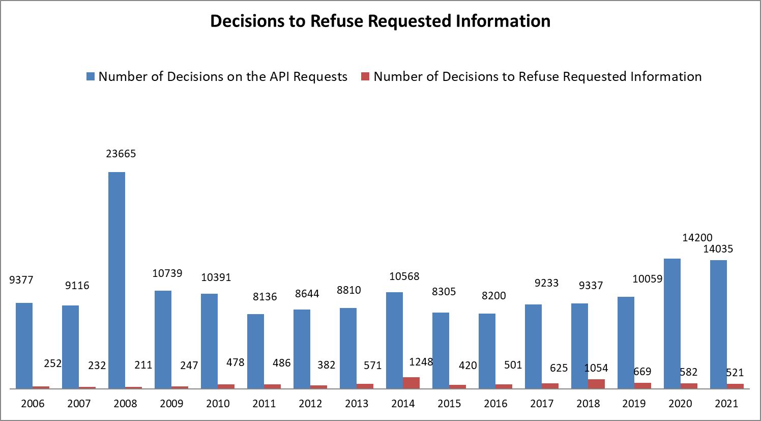 The number of decisions to refuse access to requested information for 2021 is 3,7%, comparable to 2020 – 4 %, and in 2019 – 6%.