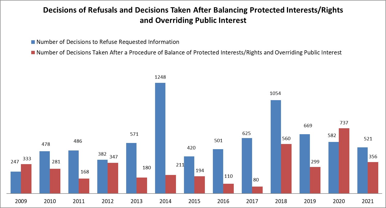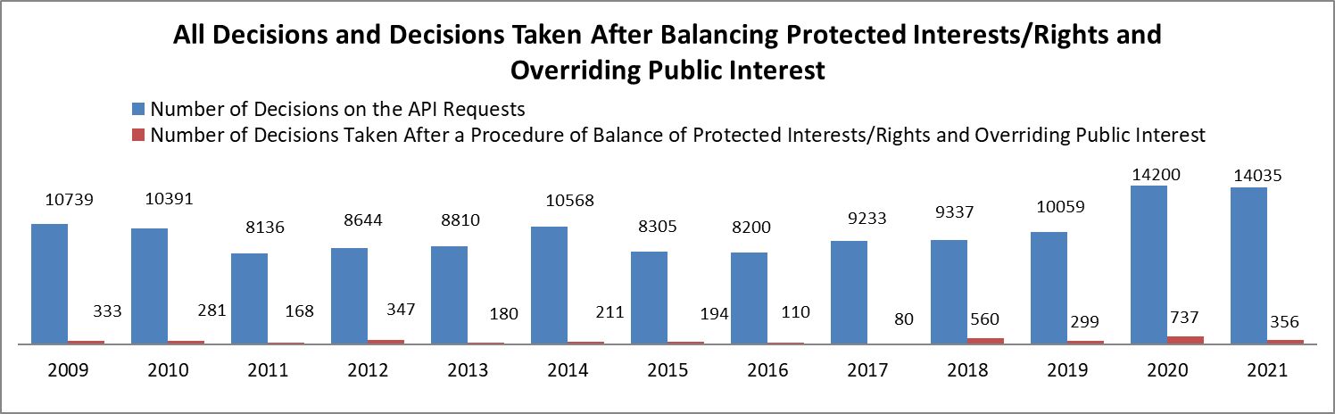 After the obligation for balancing protected rights and interests and the overriding public interest was introduced with the APIA amendments (State Gazette, issue 104/2008), data about decisions taken after such a balance appear in the reports since 2009. In order to comprehend these data, we should take into consideration the data about the number of decisions to refuse access and the grounds for these refusals.