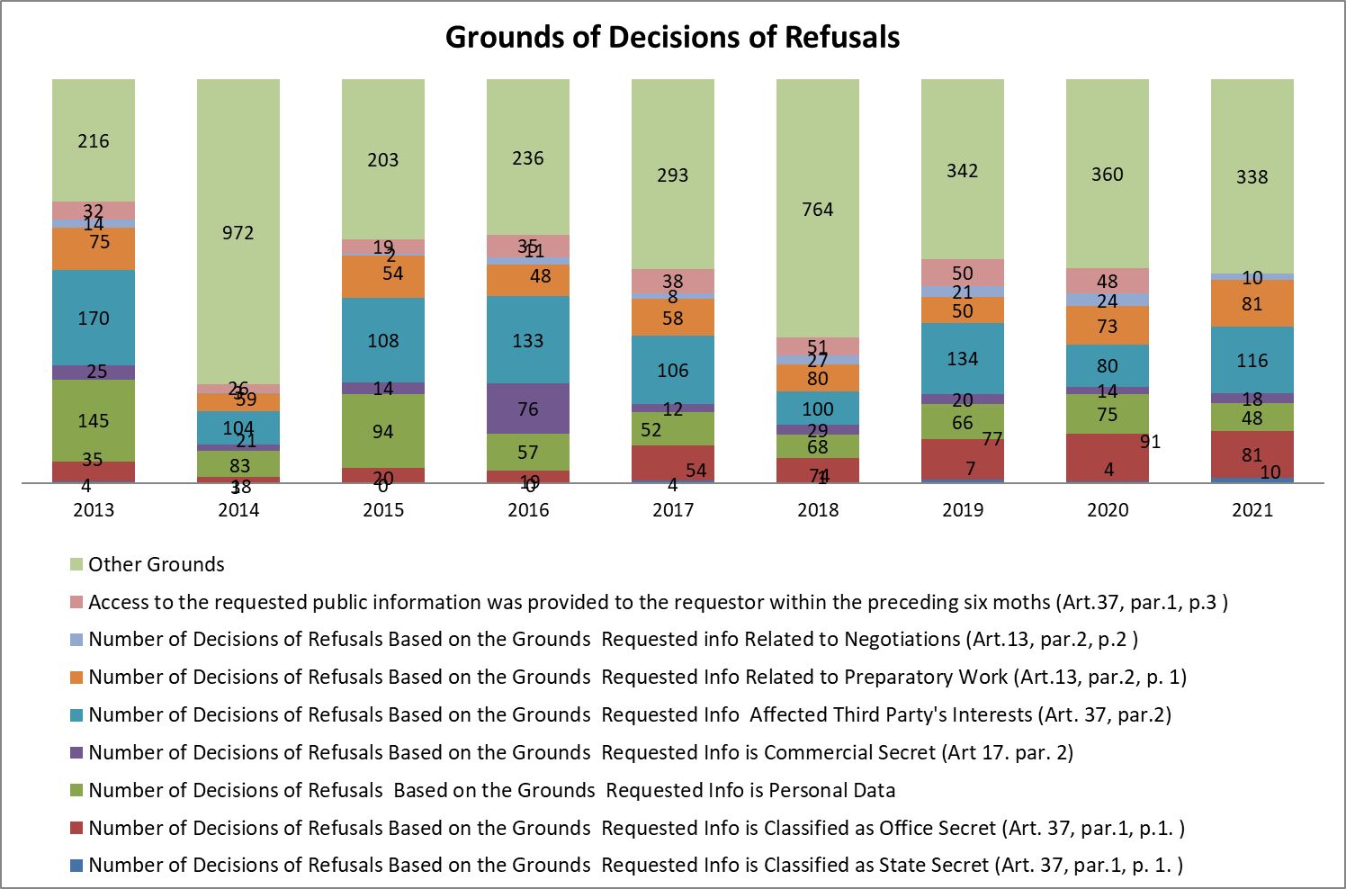Out of the legitimate grounds for refusals, provided by the law, only those stipulated by Art. 37, Para. 1, Item 1 – the requested information is classified or other protected secret, are not subject to balance against the overriding public interest, as the balance of interest has been done by the legislator. The restriction provided by Art. 37, Para. 1, Item 3 of the APIA, is not subject to the public interest balance either, namely, “the requested information has been provided to the requestor during the previous 6 months,” which is a restriction which does not protect rights and interests. If we look at the data about the decisions to refuse access and the decisions after a balance of interests, as well as those subject to the overriding public interest assessment, i.e. third party’s interests, trade secret, preparatory documents (Art. 13, Para. 1. Item 1) and the negotiation process (Art. 13, Para. 1, Item 2), it remains unclear why the cases when balance of interests was made are so few.