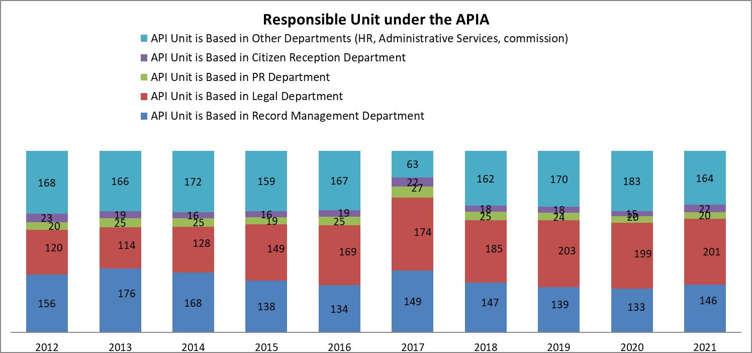 Pursuant to the 2007 APIA amendments, the heads of the administrative structures in the executive power system should assign officials to be directly responsible for the provision of public information (Final Provisions to the Law on Amendments to the APIA, State Gazette issue 49/ 2007, §18). Information about such units/ official can be found in the government reports since 2006. In 2021, 34 administrative structures still do not have such a unit/official.