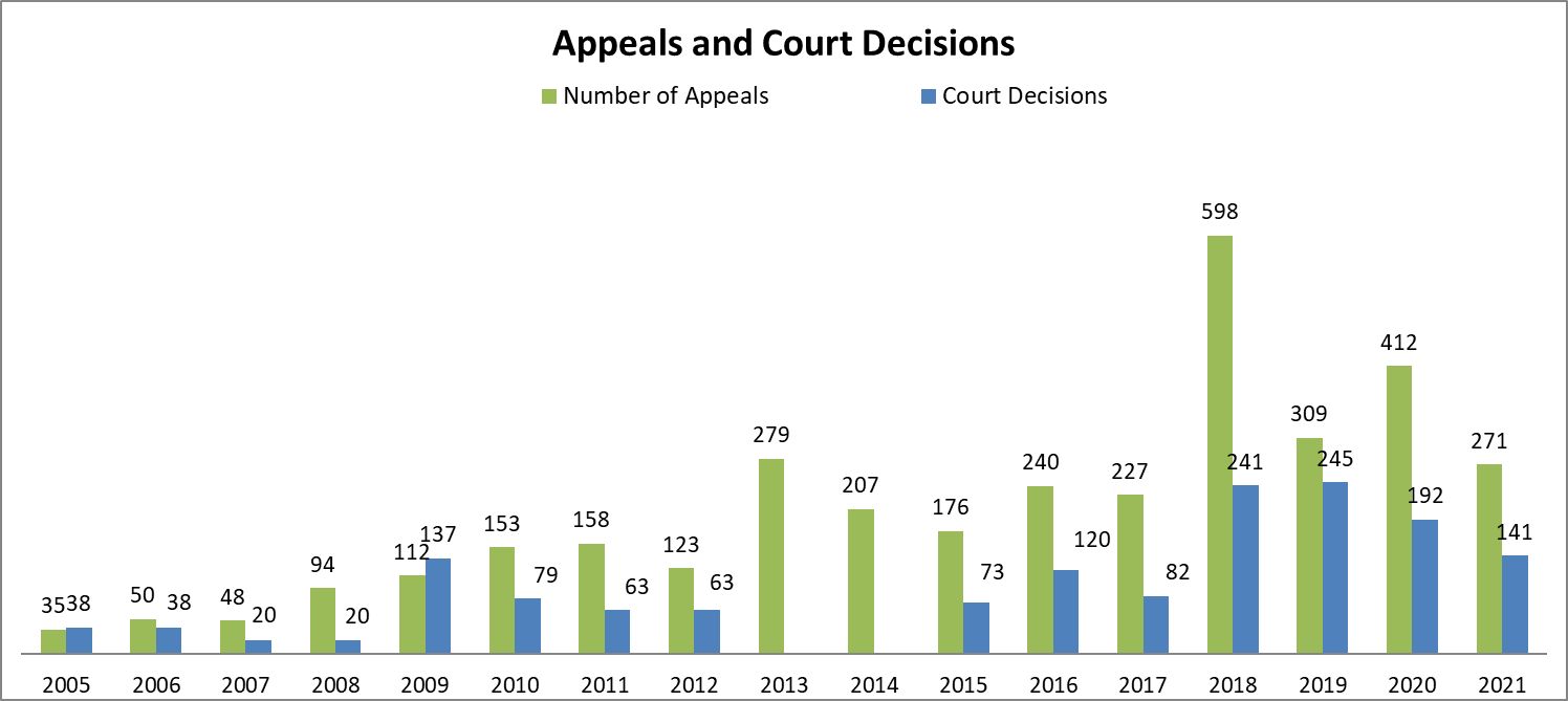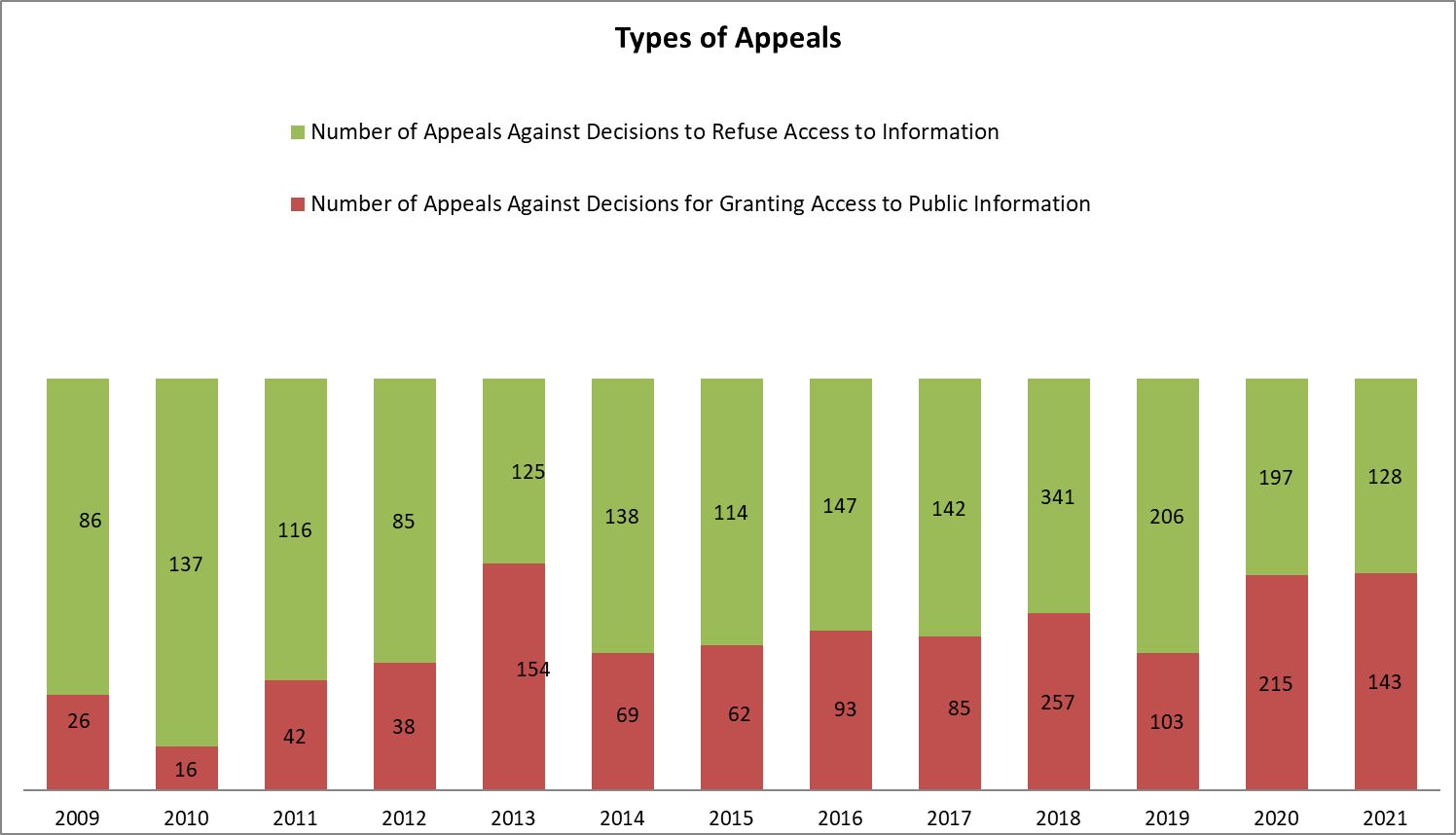 Pursuant to the provisions of the APIA, the requestors have the right to appeal the decisions or the refusals of access to public information before the administrative courts through the public body which have delivered the decision. The reports on the state of administration contain data on the appeals and the court decisions during the years.