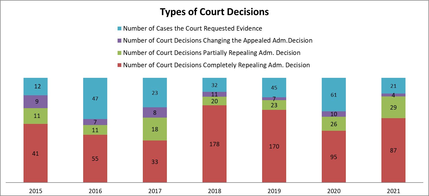 As it is apparent from the chart below summarizing the data from the Government’ reports, the highest number of court decisions is of those which repeal completely the decision of the public body which has delivered the decision granting or refusing access.