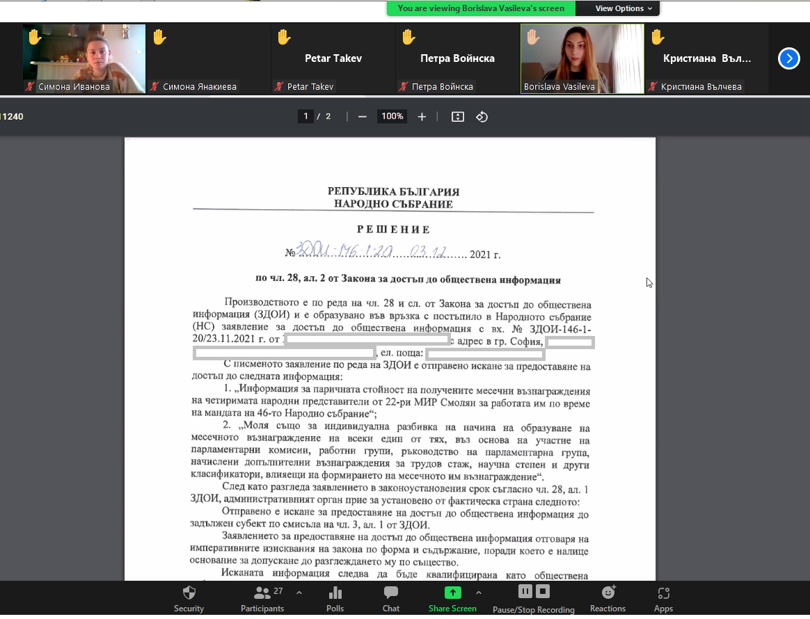The students filed ATI requests to various public institutions concerning topics of interest, such as infrastructural problems or investments in the areas they live, or matters of public interest in their home towns, or covered by the news in recent months. AIP legal team members Stephan Anguelov and Kiril Terziiski consulted the requests prior to their sending and helped students with practical tips on research, filing and analysis of the disclosed information.