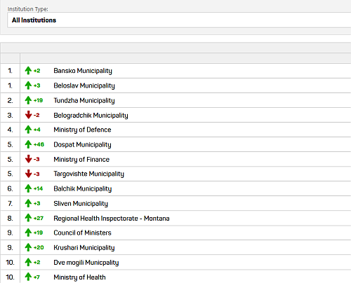 Also, Ratings of agencies, commissions, independent state bodies; Ratings of the institutions by region; Ratings of the regional offices of the Ministry of Interior, of the Ministry of Environment and Waters, the Ministry of Education, the Ministry of Agriculture, Foods and Forests, etc.