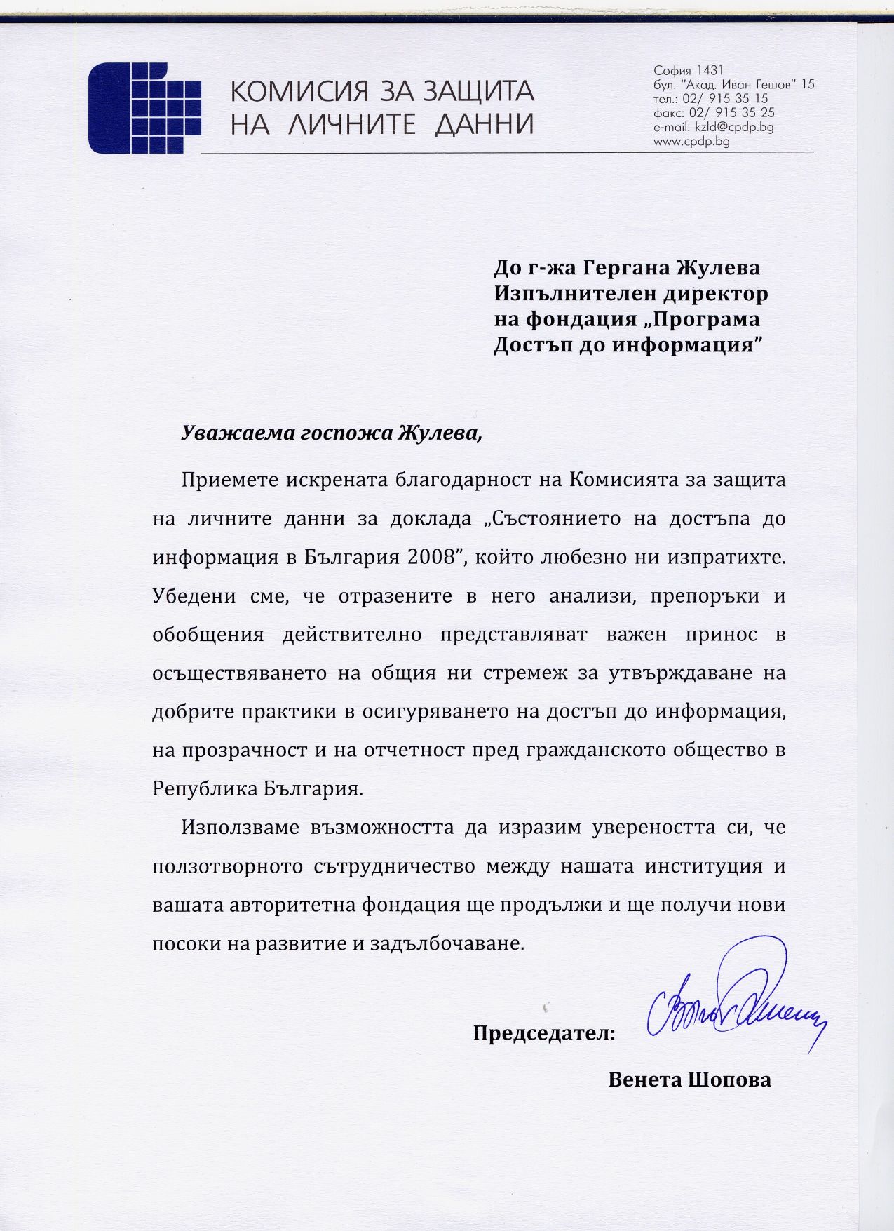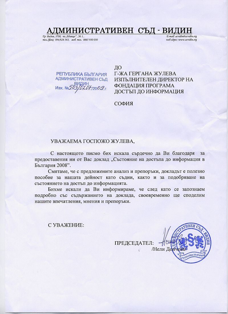Писмо от председателя на Комисията по защита на личните данни, г-жа Венета Шопова (jpg 314Kb) Писмо от председателя на Административен съд - Видин, г-жа Нели Дончева (jpg 128 Kb) НАЧАЛО | ПДИ | ЗДОИ | НОРМАТИВНА УРЕДБА | ПРАВНА ПОМОЩ | ОБУЧЕНИЯ | ПУБЛИКАЦИИ | ВЪПРОСИ | ВРЪЗКИ | ТЪРСИ Българска версия Последно обновяване: 09.07.2009 © 1999 Copyright by Interia & AIP |