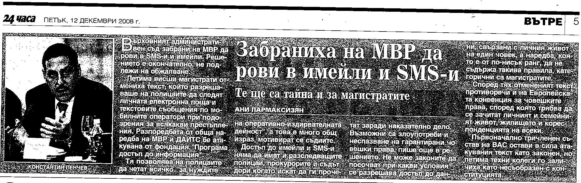 Забраниха на МВР да рови в имейли и SMS-и. Те ще са тайна и за магистратите, Ани Пармаксизян, в. "24 часа", 12 декември 2008 г.