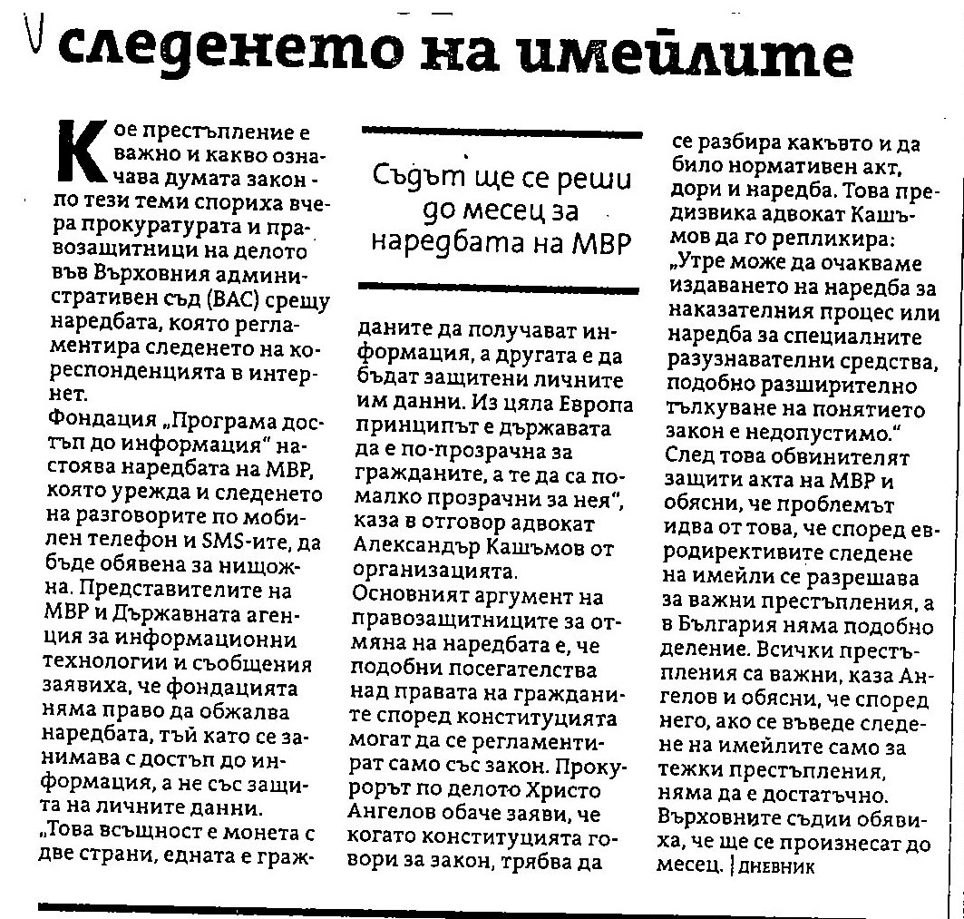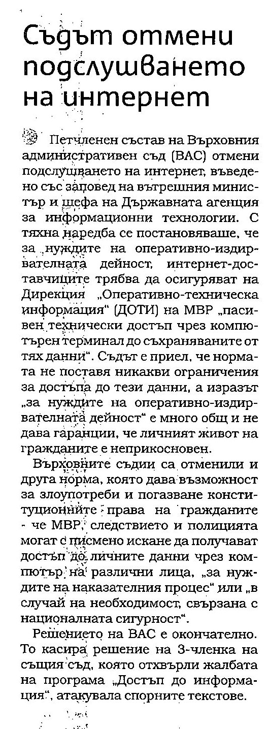 Съдът забрани на МВР да слухти в интернет. Няма никаква гаранции срещу евентуална злоупотреба със събраната информация решиха магистрати, Борис Митов, в. "Сега", 12 декември 2008 г.