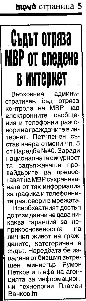 Съдът отряза МВР от следене в Интернет, в. "Труд", 12 декември 2008 г.