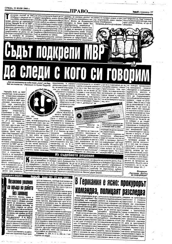 Съдът подкрепи МВР да следи с кого си говорим, в. "Труд", 23 юли 2008 г.