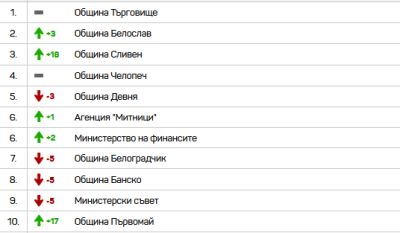 Сравнителният рейтинг на институциите индикира позициите нагоре или надолу в Рейтинга, спрямо резултатите на всяка институция от предходната година: https://data.aip-bg.org/surveys/Y3Q966/comparative-rankings