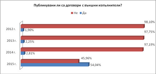 Оценката за изпълнението на задълженията за публикуване, направена в началото на 2015 г., фактически отчита непроменената законова рамка и нейните резултати ясно показват, че когато в закон са предвидени детайлни задължения, с предвиден контрол и санкции за неизпълнение, каквито бяха промените на Закона за обществените поръчки от 2014 г. в частта „Профил на купувача”, се наблюдава скок в активното публикуване на информация, която доскоро се смяташе за чувствителна.[5]