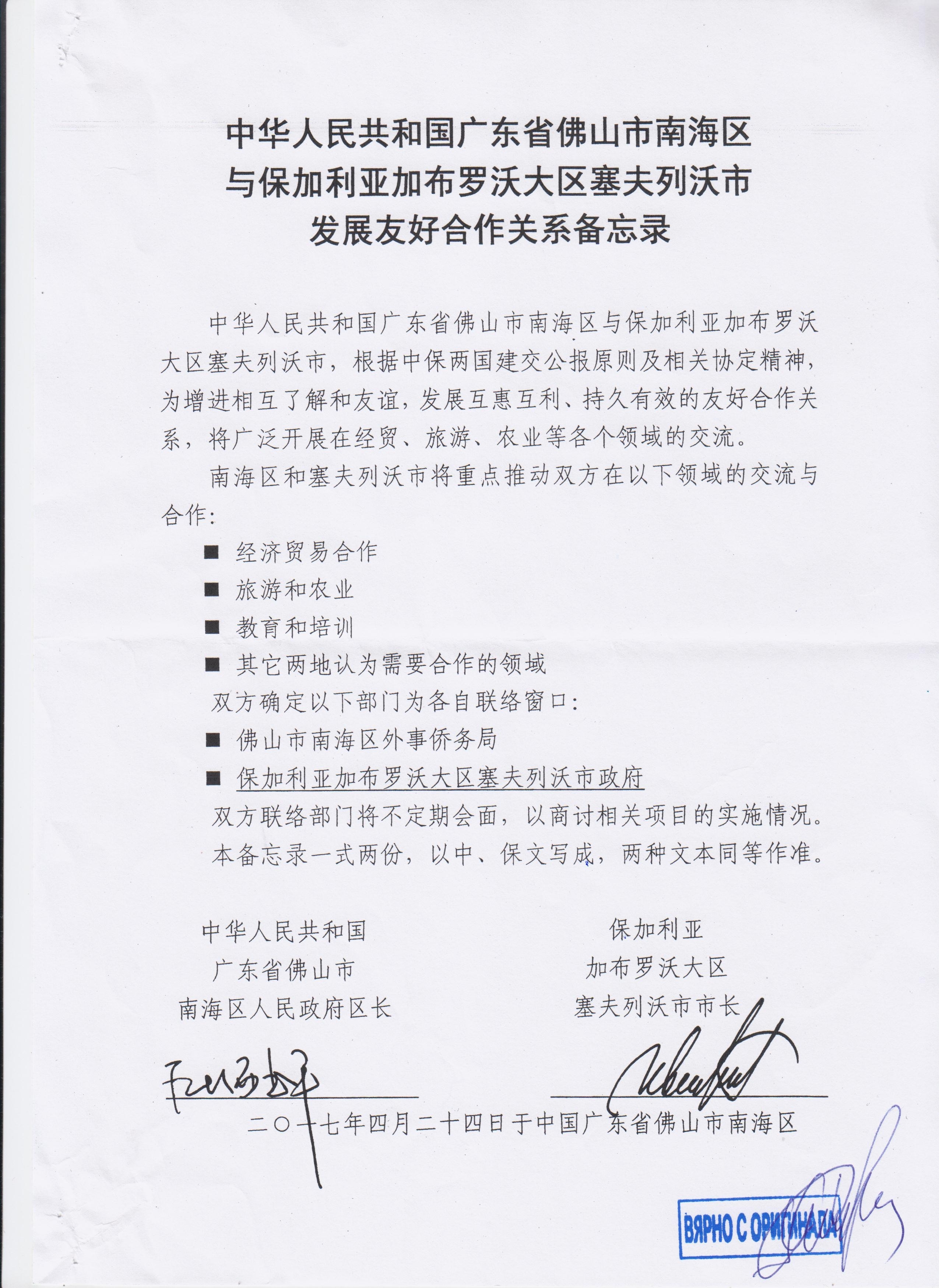 На 20 април тази година тричленна делегация от община Севлиево посети град Нанхай в Китай. Посещението бе в отговор на заявени намерения от страна на китайците за побратимяване между двата града. Няколко дни по-късно на официалния сайт на община Севлиево бе публикувана информация за подписан меморандум за сътрудничество между Севлиево и Нанхай. Информацията бе съпроводена с гръмкото „очаква се икономически подем“. Подемът явно трябваше да е за Севлиево, защото Нанхай се слави като силно развит в икономическо отношение град, административно подчинен на многомилионния Фошан.