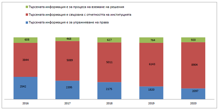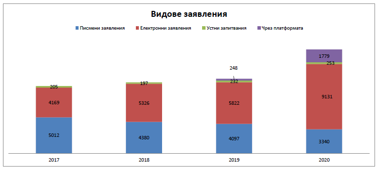 През 2020 г. в административните структури на изпълнителната власт са постъпили с 4101 повече заявления от 2019 г., именно 14 500. Това е разбираемо, поради политическата ситуация и COVID 19 пандемията. Запазва се тенденцията от 2018 г. насам за увеличаване броя на заявленията, подадени по електронен път, включително чрез използването на Платформата за достъп до обществена информация, поддържана от администрацията на МС[6].