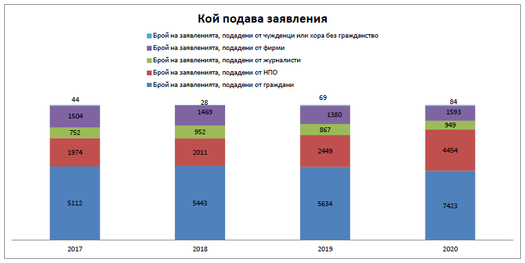 По отношение на групите заявители, съотношението не се променя. За 2020 г. отново най-много заявления са подадени от граждани, на второ място са подадените от НПО, на трето място са заявленията от фирми. Обяснимо е, че най-голям брой заявления са подадени от граждани, поради факта, че заявителите не са длъжни да посочват професия, принадлежност към фирми, НПО-та и медии. Тези, които са подали заявления от името на медия, фирма и НПО попадат в статистиката.