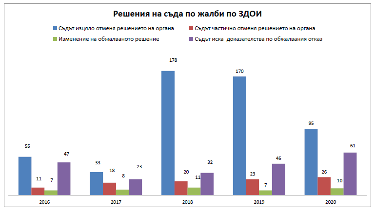 Ако до 2020 година преобладаваха жалбите срещу решения за отказ, сега наблюдаваме увеличаване на жалбите срещу решения на административния орган. Причините са повтарящи се опити да се игнорира стабилна съдебна практика, да се твърди, че информацията, която създават и съхраняват, не е обществена, и други, които ни връщат към непредвидените в закона основания за отказ.
