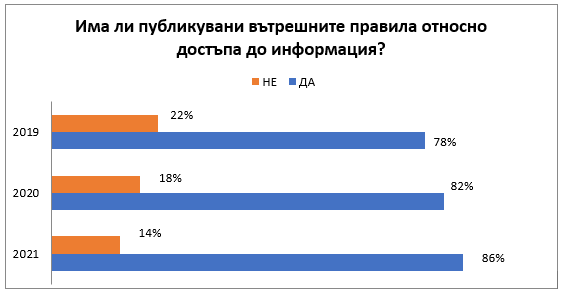В доклада на МС се отчитат 550 администрации с Вътрешни правила за работа по ЗДОИ. Тук трябва да се отбележи, че тези ВП би трябвало, според изискванията на закона (чл.15а, ал.2) да бъдат публикувани в секция „Достъп до информация“ в интернет страницата на органа на власт. Данните от проучването на Програма достъп до информация от 2021 г. показват, че това са направили 482 администрации.[4]