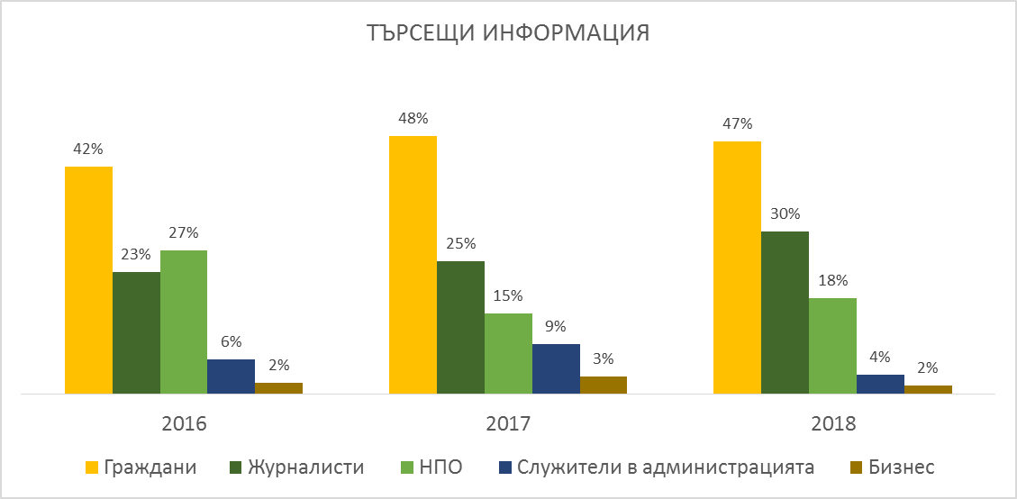 Най-често информация по реда на ЗДОИ се търси от граждани, журналисти и неправителствени организации. И през 2018 г. най-много консултации са предоставени на граждани - 86 случая. От неправителствени организации са постъпили 34, а в 58 са ни потърсили журналисти от централни и местни медии и координатори на ПДИ. В 3 случая екипът ни е бил потърсен за консултация от служители в администрацията, а в други 3 – от представители на бизнеса и др.