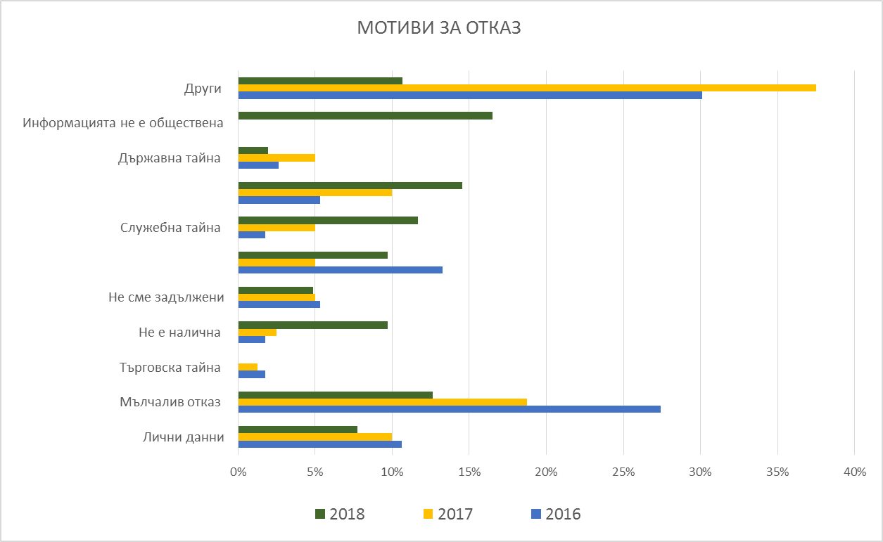 През изтеклата година е налице намаляване на мълчаливите откази. Увеличават се отказите, основани на защита интересите на третото лице – 10, а през предходната година бяха 4. През годината се забелязва зачестяване на отказите на основание държавна и служебна тайна – 14, както и основанието, касаещо подготвителна информация – чл.13 ал.2 от ЗДОИ – също 15.